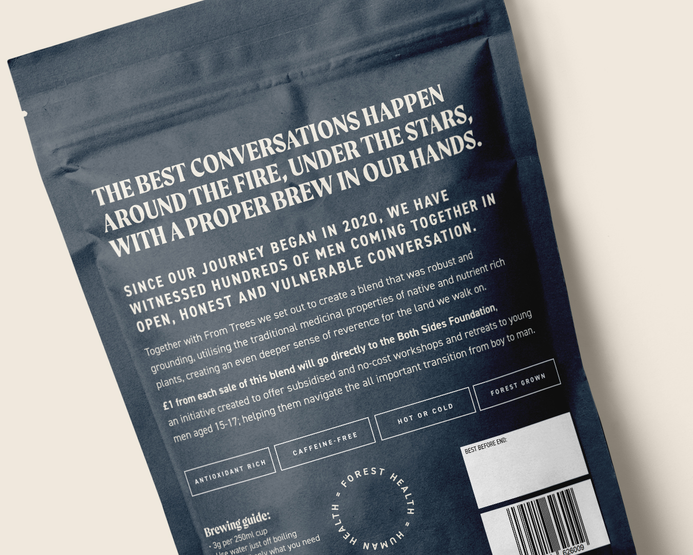 Meanwhile, caffeine-free plant tea, Equilibrium, is a collaboration between a charity connected to male-only retreats, and a Cornish tea company. Its brand and packaging was designed by Shepherd.