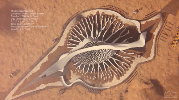 “Trên sao Hỏa, thách thức thực sự là làm thế nào để sử dụng tốt nhất các nguồn tài nguyên của nó để xây dựng một hệ thống khép kín… Sử dụng tài nguyên tại chỗ (ISRU) là câu trả lời, với việc sử dụng đá phong hóa của sao Hỏa, sản xuất oxy từ bầu khí quyển sao Hỏa, sản xuất điện từ các tấm pin mặt trời và khai thác nước.“Với nguồn cảm hứng từ phép đo sinh học, cấu trúc mang tính biểu tượng của lilypad là [nơi] bắt đầu tốt nhất… vì mạng lưới các cấu trúc xương sườn trong lilypad đại diện cho hệ thống khép kín của Sử dụng tài nguyên tại chỗ cho cấu trúc trang trại (ISRU).”